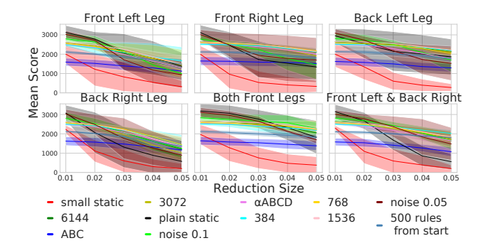 We evaluate five different reductions, reducing the length of an "ankle" to 0.39, 0.38, 0.37, 0.36, and 0.35, respectively. One by one, each of the four legs have their ankle reduced to each of these five lengths. In addition, we evaluate on a setting where both front legs are reduced at the same time, as well as a setting where the front left leg and the back right leg are reduced at the same time. We thus have five different reductions on six different leg combinations, amounting to 30 different morphology variations. This way we can more precisely determine how much variation from the original setting the models are able to cope with. When evaluating on a varied morphology, we adapt the reward to solely reflect the distance traveled in the correct direction, so that no points are given for just "staying alive".