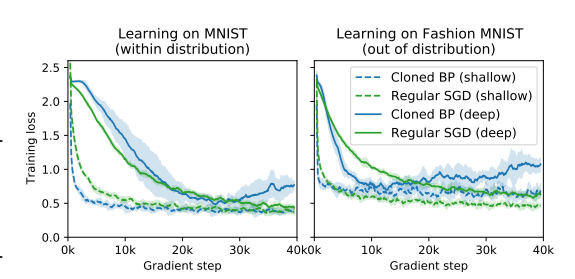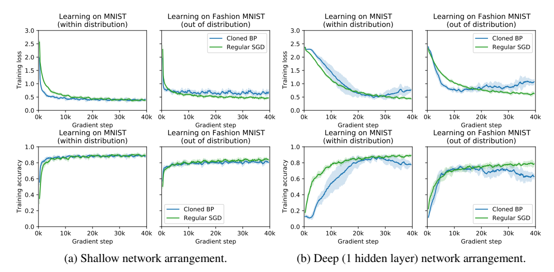 learning works both on MNIST (within distribution) and on Fashion MNIST (out of distribution). We observe that the loss is decently minimized, albeit regular gradient descent still outperforms our cloned backpropagation. This may be due to non-zero errors during learning algorithm cloning, in particular when these errors accumulate in the deeper architecture. It is also possible that the VSML states ('weights') deviate too far from ranges seen during cloning, in particular in the deep case when the loss starts increasing. We obtain 87% (deep) and 90% (shallow) test accuracy on MNIST and 76% (deep) and 80% (shallow) on Fashion MNIST (focusing on successful cloning over performance).