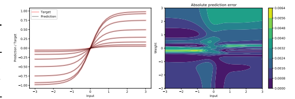 VSML RNNs can implement neural forward computation In this experiment, we optimize the VSML RNN to compute y = tanh(x)w. [Figure 10](#fig-10) (left) shows how for different inputs x and weights w the LSTM produces the correct target value, including the multiplicative interaction. The heat-map (right) shows that low prediction errors are produced but the target dynamics are not perfectly matched. We repeat these LSTMs in line with Equation 7 to obtain an 'emergent' neural network.