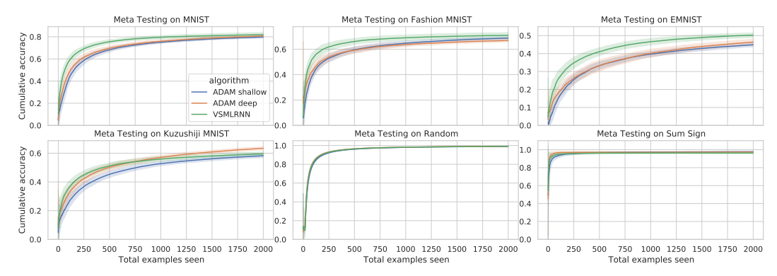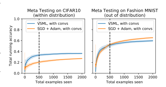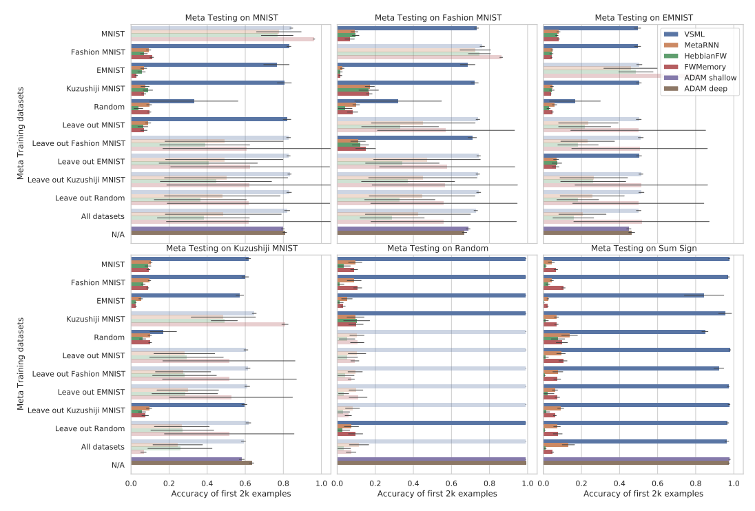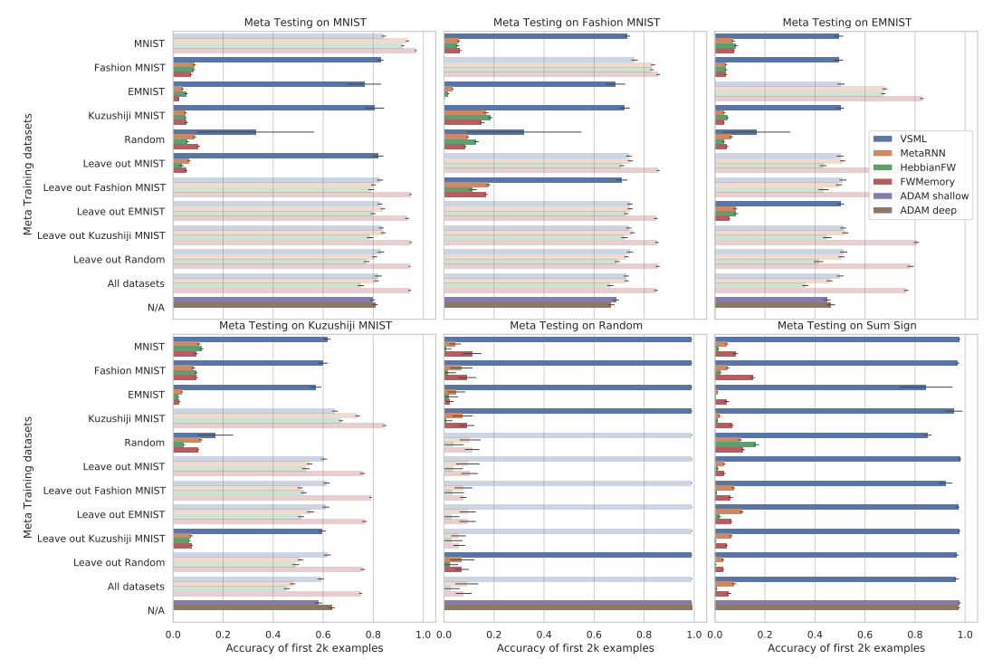 and meta test, thus requiring stronger generalization ([Figure 6](#fig-6), [Figure 8](#fig-8)). In contrast, VSML generalizes well to unseen datasets, e.g. Fashion MNIST, although it does learn more slowly on Omniglot. Finally, these new results demonstrate how VSML learns significantly faster on Omniglot compared to SGD with Adam, thus highlighting the benefits of the meta learning approach adopted in this work.