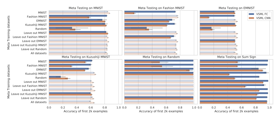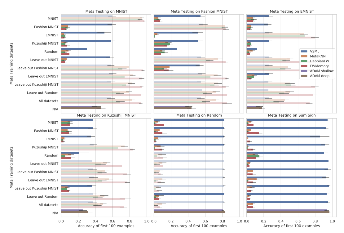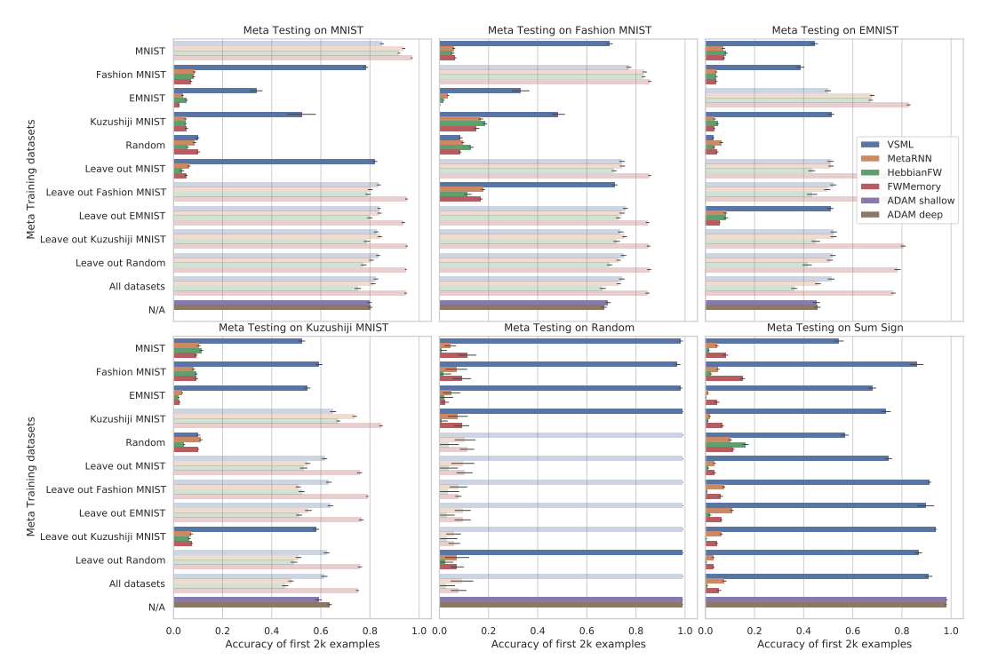 To better understand how different meta training distributions and meta test datasets affect VSML RNNs and our baselines, we present several different combinations in Figure 8. The opaque bars represent tasks that were not seen during meta training and are thus most relevant for this analysis. This includes four additional datasets: (1) Kuzushiji MNIST [7] with 10 classes, (2) EMNIST [9] with 62 classes, (3) A randomly generated classification dataset (Random) with 20 data points that changes with each step in the outer loop, and (4) Sum Sign which generates random inputs and requires classifying the sign of the sum of all inputs. Meta training is done over 500 randomly drawn samples per outer iteration. Each algorithm is meta trained for 10k outer iterations. Inputs are randomly projected as in Section 4.3 (for VSML; the baselines did not benefit from these augmentations). We again report the cumulative accuracy on all data seen since the beginning of meta test training. We compare to SGD with a single layer, matching the architecture of VSML, and a hidden layer, matching the number of weights to the size of $V_L$ in VSML. We also have included a Hebbian fast weight baseline [25] and an external (fast weight) memory approach [42].