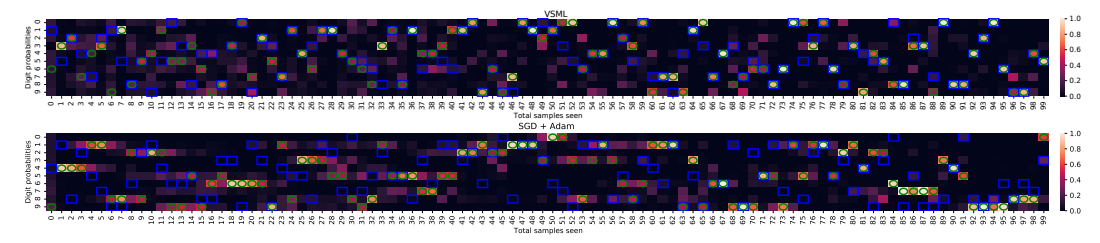 Given that VSML seems to learn faster than online gradient descent in many cases we would like to qualitatively investigate how learning differs. We first meta train on the full MNIST dataset as before. During meta testing, we plot the output probabilities for each digit against the number of samples seen in [Figure 9](#fig-9). We highlight the ground truth input class as well as the predicted class . In this case, our meta test dataset consists of MNIST digits with two examples of each type. The same digit is always repeated twice. This allows us to observe and visualize the effect with only a few examples. We have done the same introspection with the full dataset in Appendix B.