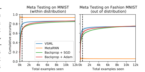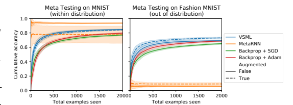 with binary $c_t$ indicating prediction correctness). For each example, the prediction when this example was fed to the RNN is used, thus measuring sample efficient learning. This evaluation protocol is similar to the one used in Meta RNNs [56, 10]. We observe that learning is considerably faster compared to the baseline of online gradient descent (no mini batching, the learning rate appropriately tuned). One possibility is that VSML simply overfits to the training distribution. We reject this possibility by meta testing the same unmodified RNN on a different dataset, here Fashion MNIST. Learning still works well, meaning we have meta learned a fairly general LA (although performance at convergence still lacks behind a little). This generalization is achieved without using any hardcoded gradients during meta testing purely by running the RNN forward. In comparison to VSML, a Meta RNN heavily overfits.