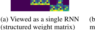 This corresponds to interpretation (A) with the weight matrix visualized in Figure 1a. To distinguish between the single sparse shared RNN and the connected RNNs, we now call the latter sub-RNNs.