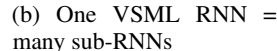 - B VSML as message passing between RNNs (Figure 1b). We choose a simple sharing and sparsity scheme for the weight matrix such that it corresponds to multiple RNNs with shared parameters that exchange information.