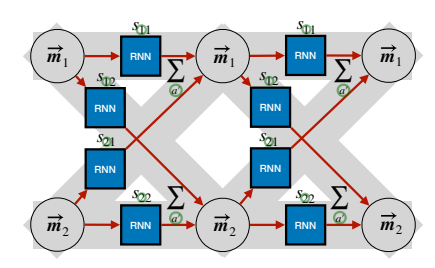 where the message $\overrightarrow{m}_b = \sum_{a'} f_{\overrightarrow{m}}(s_{a'b})$ with $b \in \{1,\ldots,A=B\}$ , $f_{\overrightarrow{m}}:\mathbb{R}^N \to \mathbb{R}^{N'}$ is fed as an additional input to each RNN. This is related to Graph Neural Networks [51, 58]. Summing over the axis A (elements a') corresponds to an RNN connectivity mimicking those of weights in an NN (to facilitate interpretation $\widehat{\mathbb{C}}$ ). We emphasise that other schemes based on different kinds of message passing and graph connectivity are possible. For a simple $f_{\overrightarrow{m}}$ defined by the matrix $C \in \mathbb{R}^{N \times N}$ , we may equivalently write