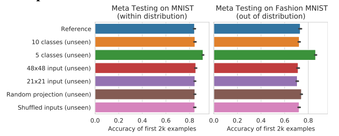 Figure 7: The meta learned learning algorithm is robust to permutations and size changes in the inputs and outputs. All six configurations have not been seen during training and perform comparable to the unchanged reference. Standard deviations are over 32 seeds.