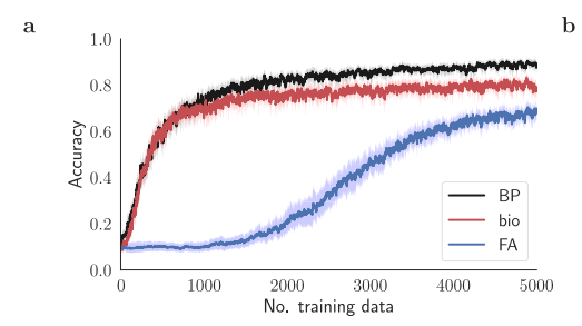 Fig. 1 | Feedback alignment learns poorly in deep models. Performance of benchmark learning schemes while training a 5-layer fully connected classifier network on MNIST digits^{47} with online learning. a Accuracy versus the number of training data for Feedback Alignment (FA)5 and backprop (BP)1 methods, compared to the discovered biologically plausible plasticity rule (bio) presented below. b The angle $\alpha_\ell$ between the teaching signal $\mathbf{e}_\ell^{FA}$ transmitted by the Feedback Alignment