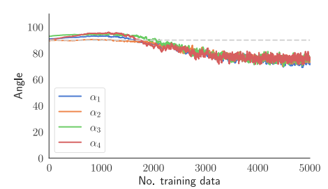 classification task. c Alignment angle $\alpha_\ell$ of the teaching signals of $\mathcal{F}^{\text{pool}}$ with the ones for backprop for $\ell=1,2,3$ , and 4. As discussed in Fig. 1, $\alpha_5=0$ . d Convergence of the plasticity coefficients $\mathbf{O} = \{\theta_r | 0 \le r \le R-1\}$ with R=10. Using L1 regularization in meta-loss (Eq. (6)) sparsifies the set of meta-parameters and helps with identifying the most influential plasticity terms in learning (see Supplementary Note 6 for a discussion on alternatives).