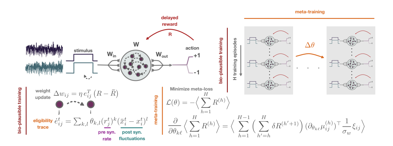 Tangent-propagation through learning. Our goal is to optimise the learning rule parameters $\Theta$ to maximise task performance, quantified as the expected cumulative reward $\langle \sum_h R \rangle$ obtained after a fixed number of learning episodes. However, the reward R depends on the network's output, which is determined by synaptic weights $\mathcal{W} = \{\mathbf{W}_{in}, \mathbf{W}, \mathbf{W}_{out}\}$ , with $\mathbf{W}$ evolving under the update rule (Eq.3). Since weights depend on eligibility traces $e_{ij}$ , themselves parameterised by $\Theta$ , the reward depends on the plasticity parameters through $\mathcal{W}$ and $\Theta$ . Directly computing $\nabla_{\Theta}\langle \sum_h R \rangle$ by backpropagating through the learning dynamics is computationally prohibitive since learning requires several hundreds of trials (Lindsey and Litwin-Kumar, 2020). We therefore, here, adopt a REINFORCE-inspired estimator (Williams, 1992), which involves computing the gradient of an expected value by observing outcomes (the rewards) and scaling a measure of what elicited that outcome (the weight updates) with the associated reward. Thus, we approximate the gradient of the expected reward by