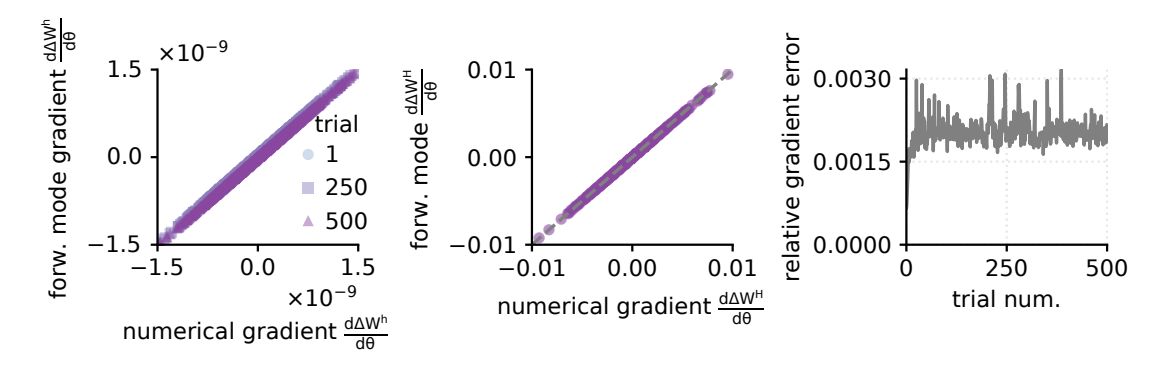 Figure 2: Validation of forward-mode gradient (FM) computation for the weight update wrt plasticity parameters $\theta$ against numerical gradients (FD). a. Comparison of numerical gradient for per-trial weight update $\Delta \mathbf{W}^{(h)}$ wrt plasticity parameter $\theta_{3,3}$ against the gradient obtained through forward mode differentiation for trials 1,250,500 . b. Comparison of cumulative gradient computed over 500 trials for the weight update wrt plasticity parameters obtained numerically and through forward mode differentiation. The forward-mode differentiation provides an exact estimation of the plasticity update gradients. c. Relative gradient error per trial computed as $\|\frac{\mathbf{d}\Delta \mathbf{W}}{\mathbf{d}\theta}^{FM} - \frac{\mathbf{d}\Delta \mathbf{W}}{\mathbf{d}\theta}^{FD}\|/\|\frac{\mathbf{d}\Delta \mathbf{W}}{\mathbf{d}\theta}^{FD}\|$ .