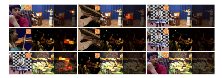 Fig. 6. What would make this sound? Similarly to Figure 5, the AVOL-Net localization output is shown given an input image frame and 1s of audio. However, here the frame and audio are mismatched. Each triplet of images shows the (left) input audio, (middle) input frame, and (right) localization output overlaid over the frame. Purely for visualization purposes, as it is hard to display sound, the frame of the video that is aligned with the sound is shown instead of the actual sound form (left). On the example of the first triplet: (left) flute sound illustrated by an image of a flute, (middle) image of a piano and a flute, (right) the flute from the middle image is highlighted as our network successfully answers the question "What in the piano-flute image would make a flute sound?" In each row the input frame is fixed while the input audio varies, showing that object localization does depend on the sound and therefore our system is not just detecting salient objects in the scene but is achieving the original goal – localizing the object that sounds.