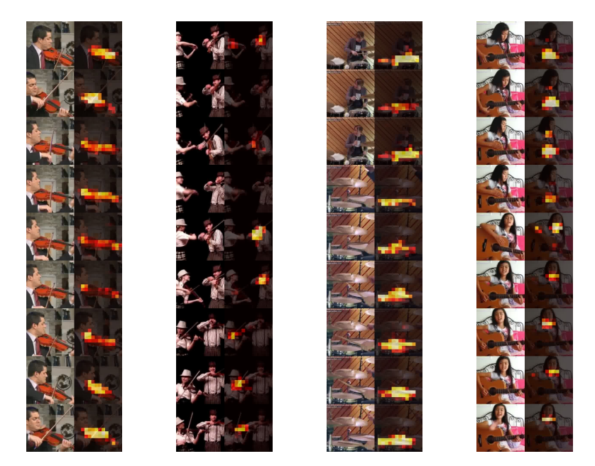 Fig. 7. What is making the sound? The visualization is the same as for Figure 5 but here each column contains frames from a single video, taken 1 second apart. The frames are processed completely independently, motion information is not used, nor there is any temporal smoothing. Our method reliably detects the sounding object across varying poses (columns 1-2), and shots (column 3). Furthermore, it is able to switch between objects that are making the sound such as interleaved speech and guitar during a guitar lesson (column 4).