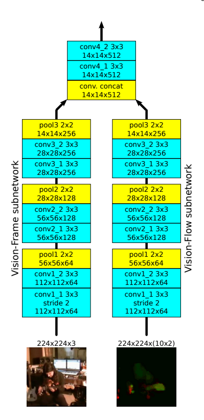 Fig. 8. AVE+OF: Vision ConvNet. The notation and some building blocks are shared with Figure 2. The vision subnetwork of the AVE+OF network is a two-stream network [30], where the image and flow streams are processed independently with 3 conv-conv-pool blocks each, followed by concatenating their outputs in the 'channel' dimension, and passing through another conv-conv block. The image is a single RGB frame, while there are 10 frames of flow (concatenated in the 'channel' dimension) where each spatial location contains a 2-D vector of horizontal and vertical displacements.