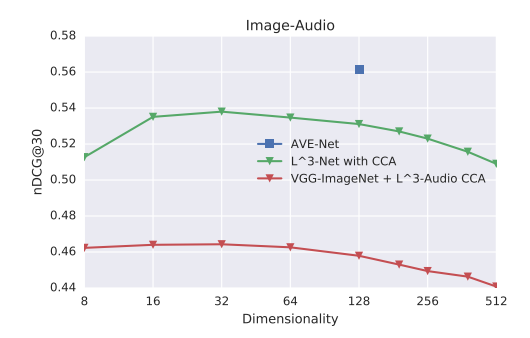 Fig. 9. Cross-modal retrieval vs embedding dimensionality. Comparison of our method with baselines in terms of the average nDCG@30 on the AudioSet-Instruments test set. Our AVE-Net beats all baselines regardless for all sizes of baseline embeddings. Note that CCA does not necessarily work better with increased dimensionality due to denoising properties of dimensionality reduction.