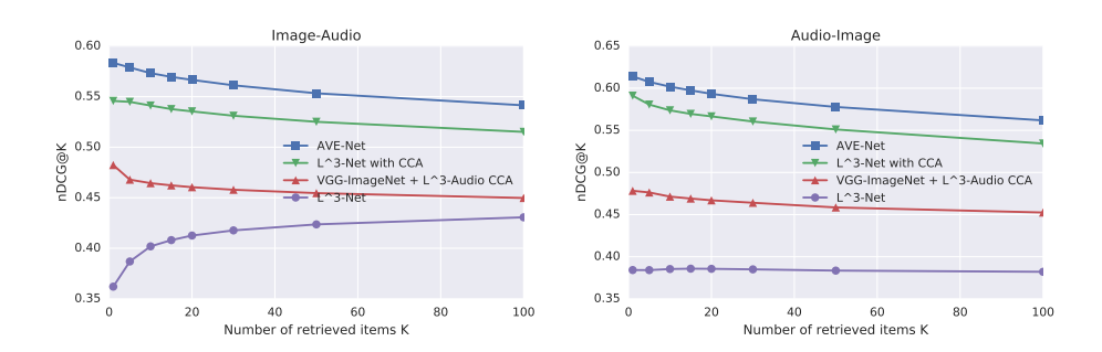 Results. The nDCG@30 for all combinations of query-database modalities is shown in Table 1. For intra-modal retrieval (image-image, audio-audio) our AVE-Net is better than all baselines including slightly beating VGG16-ImageNet for image-image, which was trained in a fully supervised manner on another task. It is interesting to note that our network has never seen same-modality pairs during training, so it has not been trained explicitly for image-image and audioaudio retrieval. However, intra-modal retrieval works because of transitivity – an image of a violin is close in feature space to the sound of a violin, which is in turn close to other images of violins. Note that despite learning essentially the same information on the same task and training data as the L 3 -Net, our AVE-Net outperforms the L 3 -Net because it is Euclidean distance "aware", i.e. it has been designed and trained with retrieval in mind.