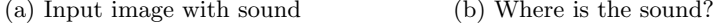 Relation to previous works. While usually hinting at object localization, previous cross-modal works fall short from achieving this goal. Harwath et al. [2] demonstrate localizing objects in the audio domain of a spoken text, but do not design their network for localization. In [4], the network, trained from scratch, internally learns object detectors, but has never been demonstrated to be able to answer the question "Where is the object that is making the sound?", nor, unlike our approach, was it trained with this ability in mind. Rather, their heatmaps are produced by examining responses of its various neurons given only the input image. The output is computed completely independently of the sound and therefore cannot answer "Where is the object that is making the sound?".