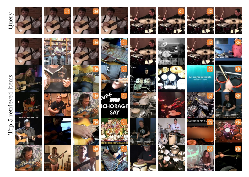 Fig. 3. Cross-modal and intra-modal retrieval. Each column shows one query and retrieved results. Purely for visualization purposes, as it is hard to display sound, the frame of the video that is aligned with the sound is shown instead of the actual sound form. The sound icon or lack of it indicates the audio or vision modality, respectively. For example, the last column illustrates query by image into an audio database, thus answering the question "Which sounds are the most plausible for this query image?" Note that many audio retrieval items are indeed correct despite the fact that their corresponding frames are unrelated – e.g. the audio of the blue image with white text does contain drums – this is just an artefact of how noisy real-world YouTube videos are.