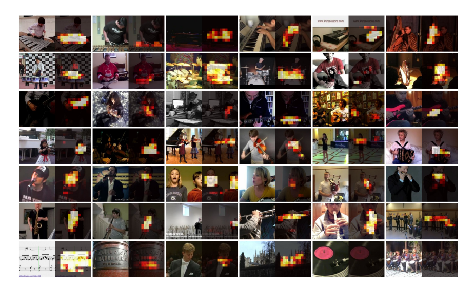 Figure 5: AVOL-Net 的定位结果。网络仅凭单帧图像和对应的音频,就能定位出图像中发声的区域(如钢琴键盘、吉他等),且不受运动信息干扰(输入为单帧)。