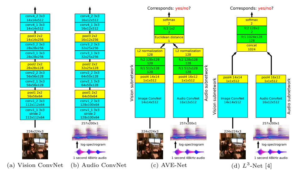 Figure 2: ConvNet 架构对比。(c) AVE-Net 明确利用嵌入之间的欧氏距离来判断对应关系,强制特征在公共空间对齐。(d) 对比 $L^3$-Net [4],其通过拼接特征后接 FC 层来判断,导致特征未在嵌入空间显式对齐,不适合检索。