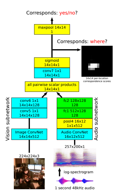 数学上,设视觉嵌入为 $f_v(I)$,音频嵌入为 $f_a(A)$,则网络优化的目标是使得对于匹配对 $(I, A)$,欧氏距离 $\|f_v(I) - f_a(A)\|_2$ 较小,而对于不匹配对则较大。